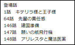 例えば「クレナ、ガノ、お菓子、雲」という感じでデータを入れておいて、PHPで「%クレナ%」と検索したらその中にクレナという文字があれば「1話 キテリラ様と王子様」と話数とタイトルを引っ張って来る、といったシステムです。